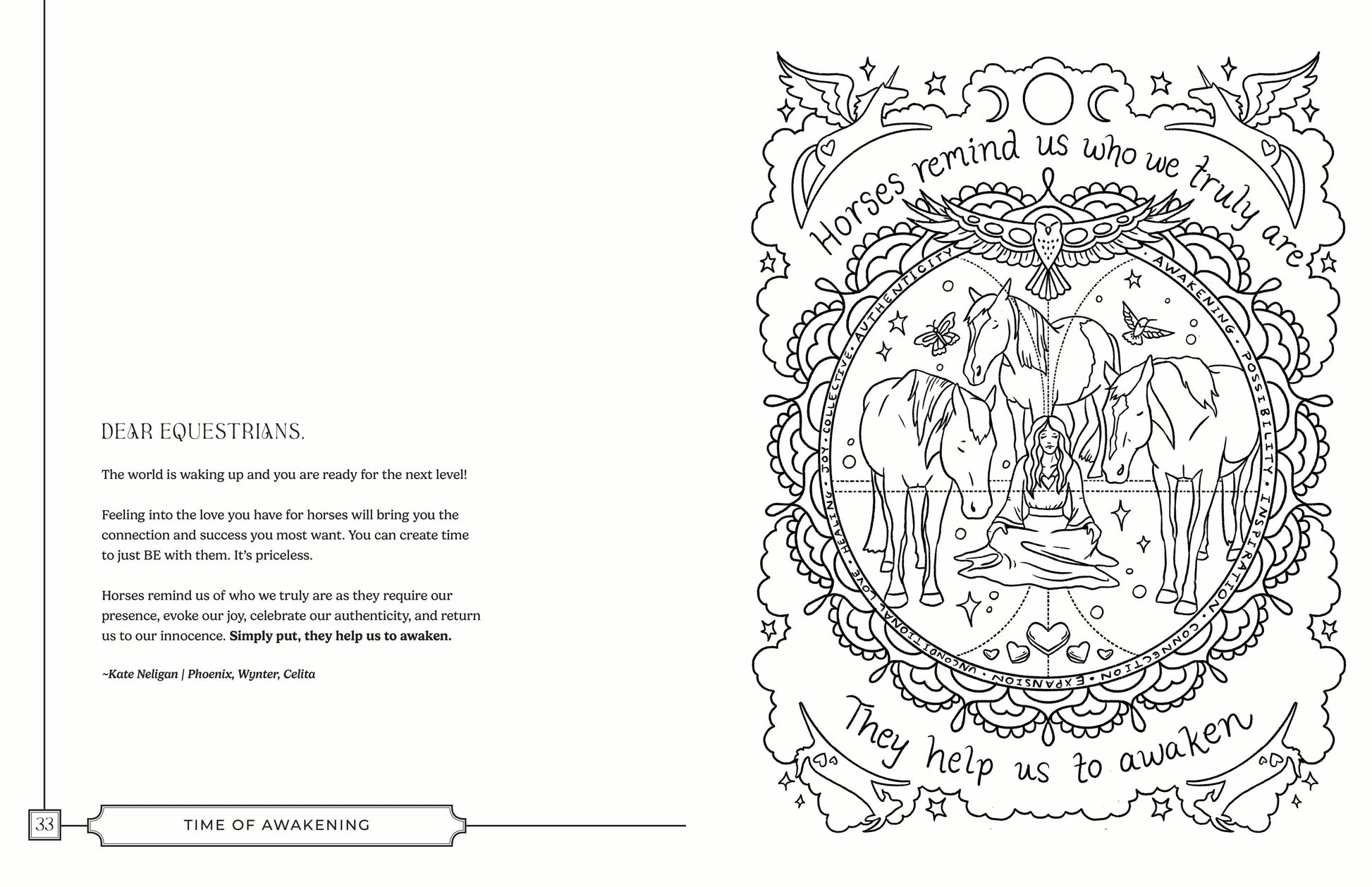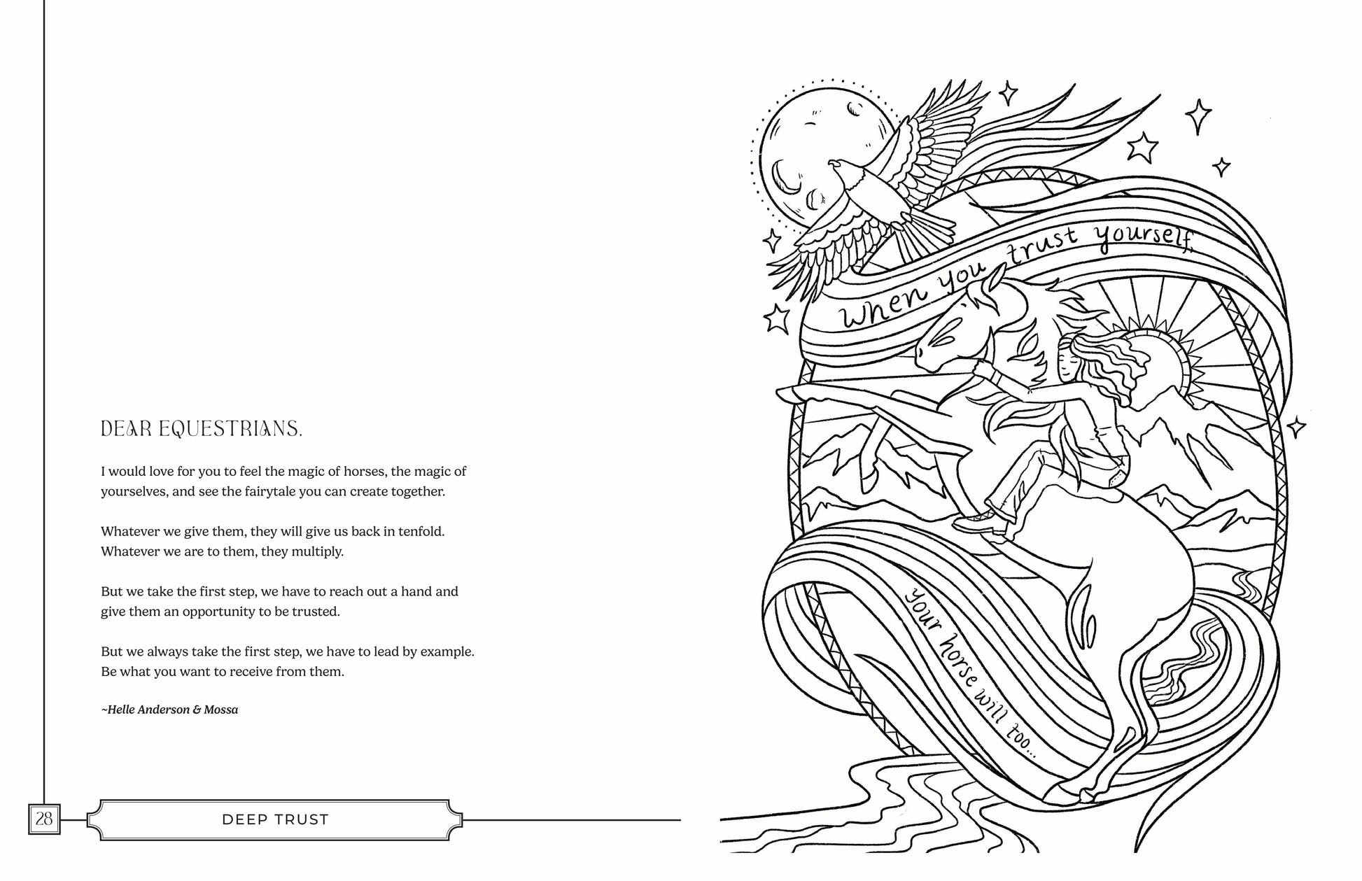 This coloring book features 33 equestrians from around the world, each page is a channeled portrait inspired by their story, their horses, and the messages they wish to share with others.